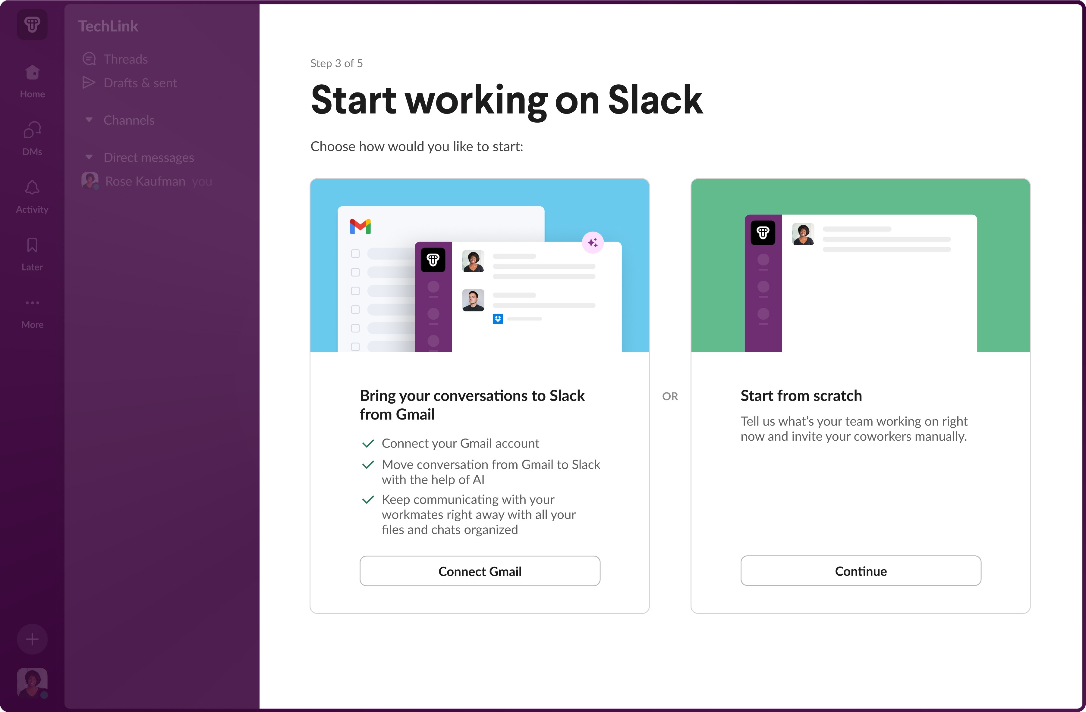 We designed an onboarding experience that analyzes users' recent email activity to automatically create relevant channels, invite the right people, and import context from recent conversations.